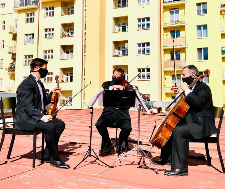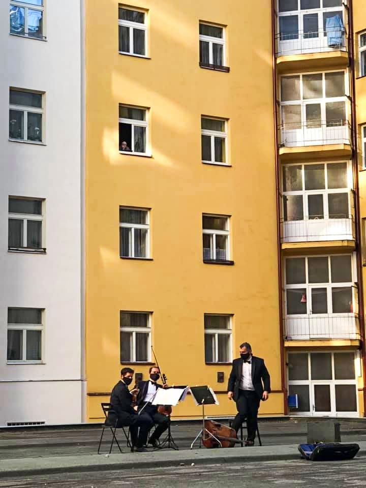(viola), Lukáš Polák (violoncello) zahráli na třech místech Prahy 3. Své miniturné po žižkovských dvorcích zahájili od 16.00 hod. vystoupením na střeše kina Aero (záznam je možné shlédnout níže), o hodinu později už hráli pro posluchače ve vnitrobloku Jeseniova/Rokycanova a poslední vystoupení přidali v 18.00 hod. na garážích ve vnitrobloku Lucemburská/Orlická/Přemyslovská/Radhošťská.