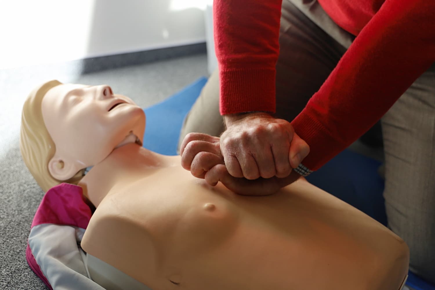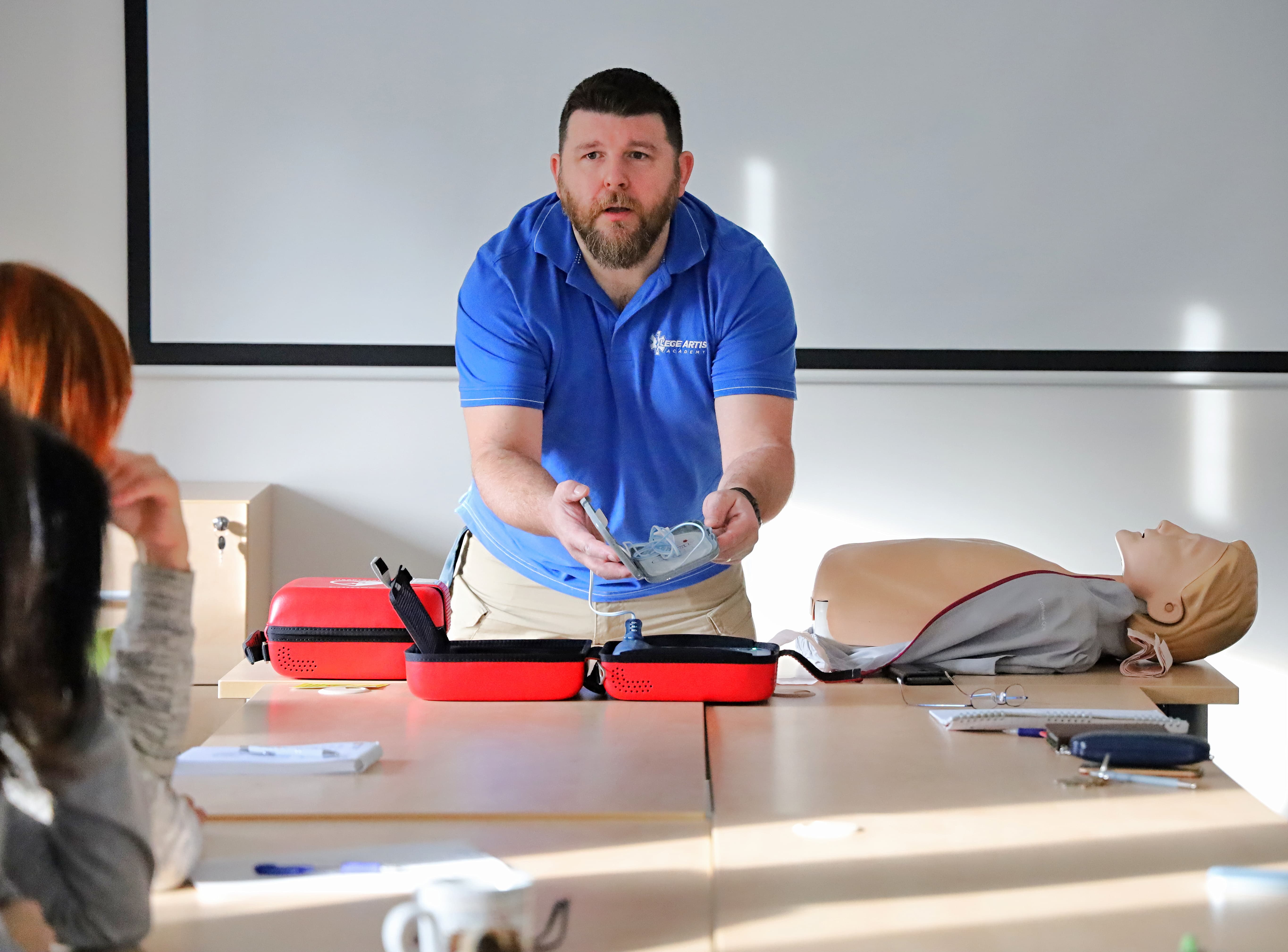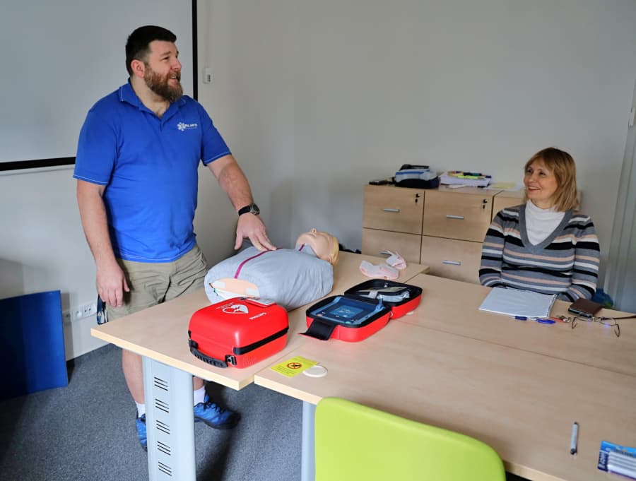 Nezbytnou součást školení představovalo praktické cvičení, které doplnilo teoretický úvod: na připravených figurínách si účastníci vyzkoušeli srdeční masáž a práci s defibrilátory. Důraz byl kladen i na předpokládanou spolupráci, kdy první pomoc poskytuje více zachránců, dále na komunikaci s dispečinkem záchranné služby včetně způsobu rychlé a správné lokalizace místa.