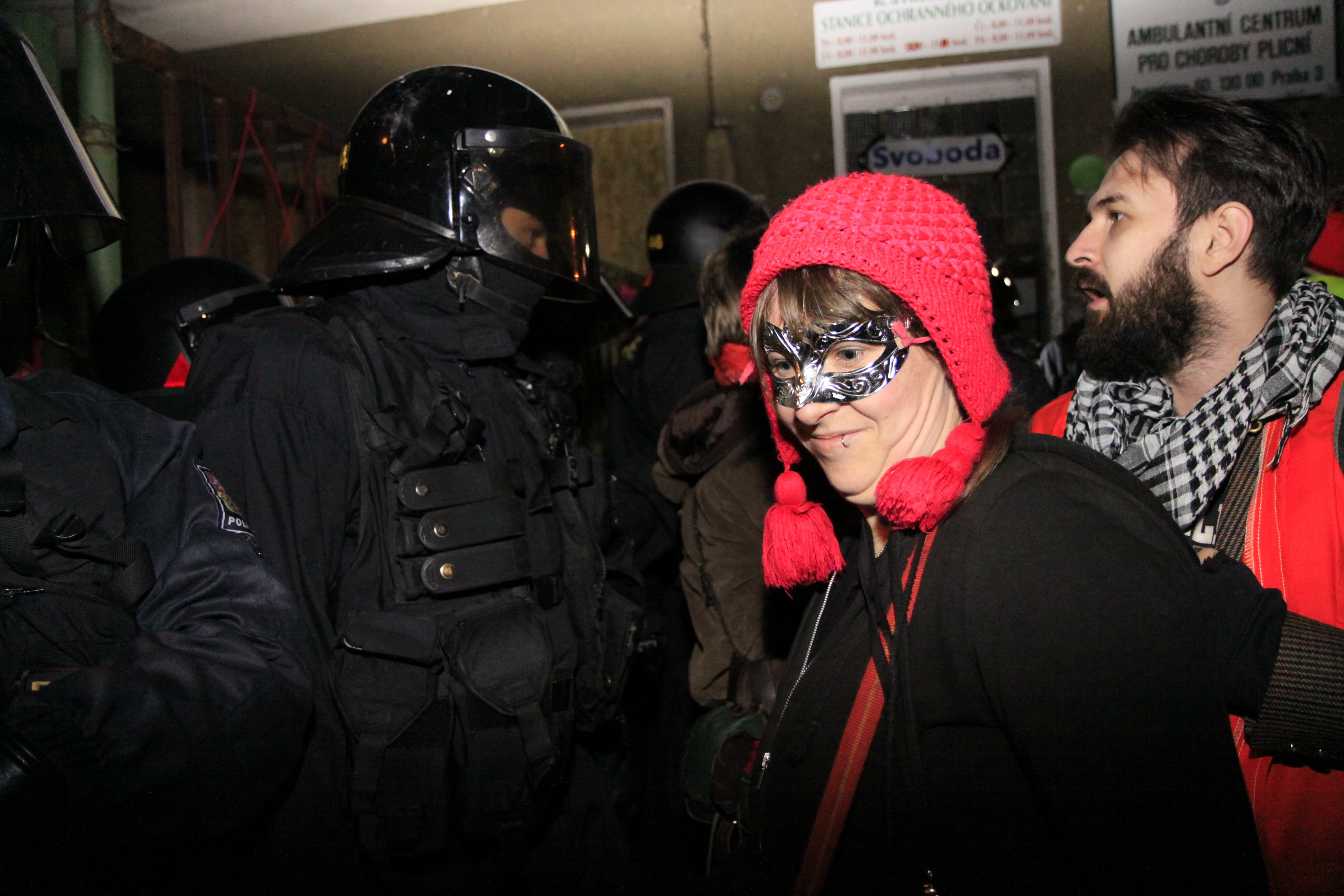 „Policisté tak museli zasáhnout, skupina nakonec uposlechla výzev policistů a budovu opustila, aniž by byly použity donucovací prostředky,“ komentovala zásah pro ČTK policejní mluvčí Jana Rösslerová. Podle očitých svědků použila policie pro vytlačení davu od objektu pepřový sprej a na místě také zasahovala pražská záchranná služba, která ošetřila dva zraněné.