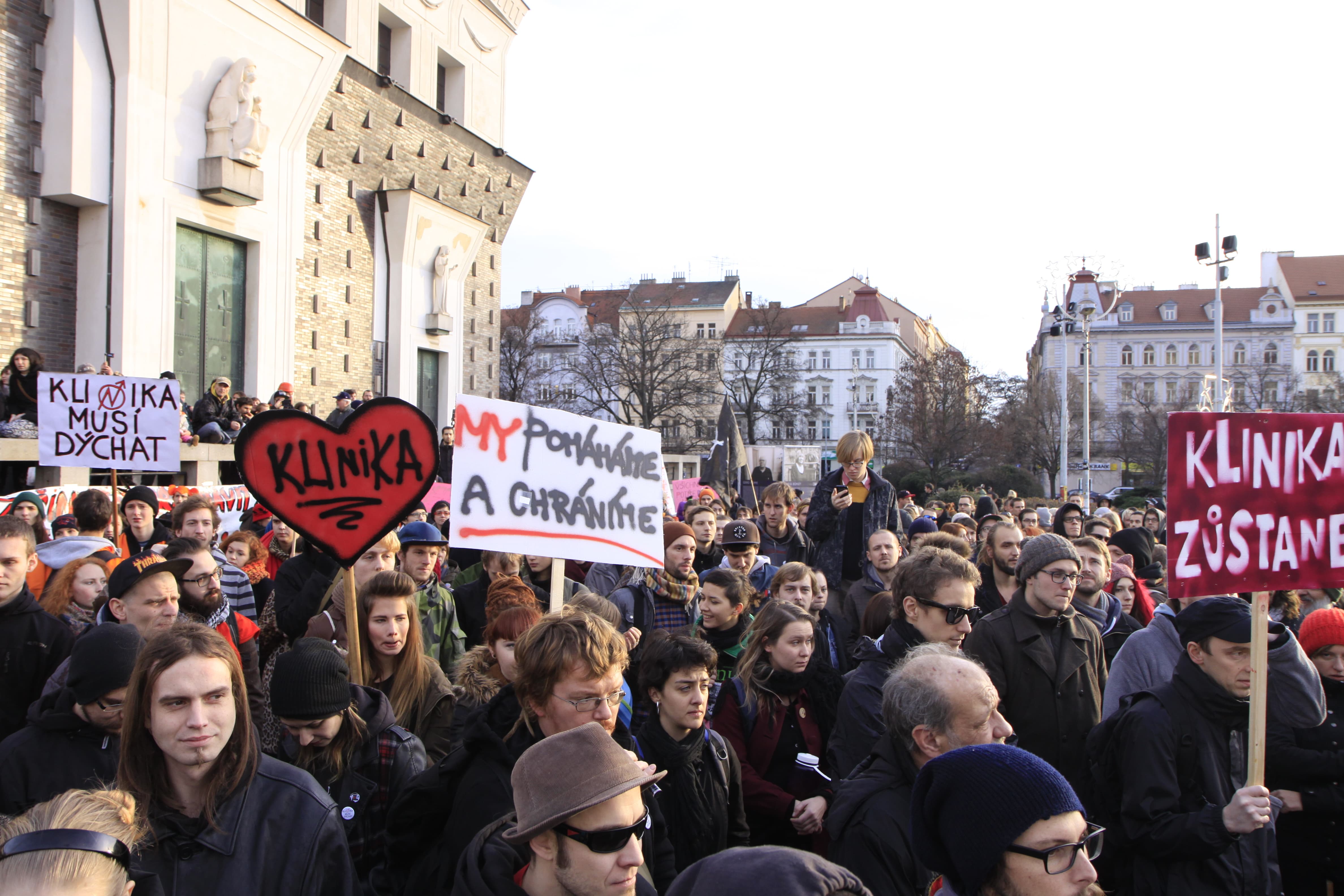 Několik stovek lidí se v sobotu 13. prosince sešlo na náměstí Jiřího z Poděbrad, aby tak podpořili občanskou iniciativu Klinika, která usiluje o přeměnu chátrajícího objektu v Jeseniově ulici na komunitní sociální centrum. Opuštěný objekt, který je ve vlastnictví státu, aktivisté obsadili před čtrnácti dny, policie ale minulý týden budovu vyklidila.