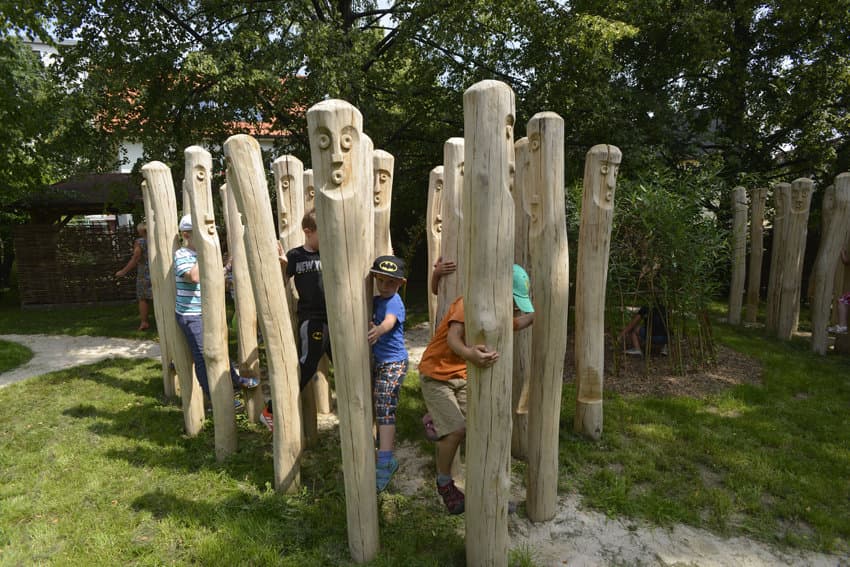 Je celé z přírodních materiálů a hlavní herní prvky tvoří devět originálních dřevěných zvířecích soch, které pro hřiště vytvořil řezbář Petr Soudek. Ústředním motivem hřiště je dřevěný šlapací drak, který do korýtek chrlí vodu, se kterou si děti mohou hrát. Interaktivních vodních prvků je na hřišti více a dětem dělají v horkých dnech radost.