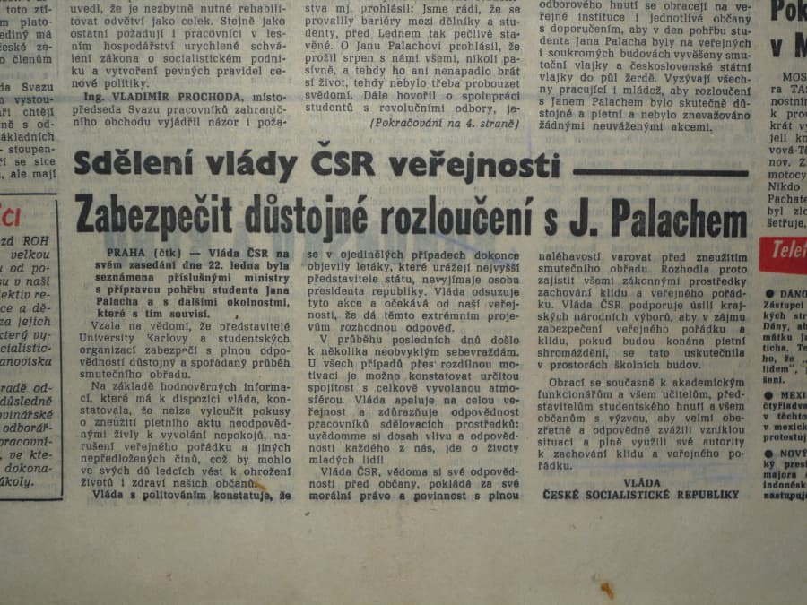Ve čtvrtek 16. ledna 1969 se v horní části Václavského náměstí polil hořlavinou a zapálil student dříve Vysoké škole ekonomické a od roku 1968 Filosofické fakulty UK Jan Palach (*1948 ve Všetatech).