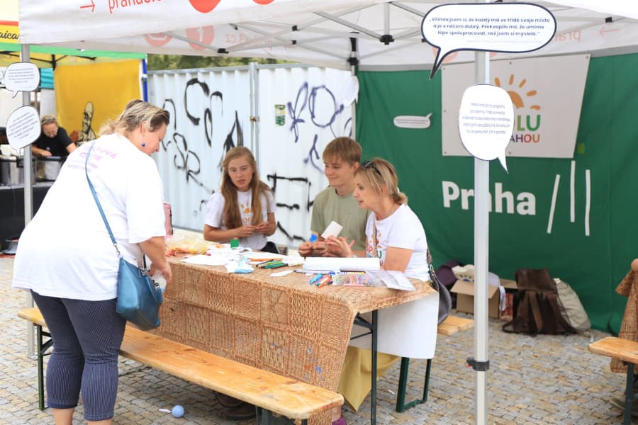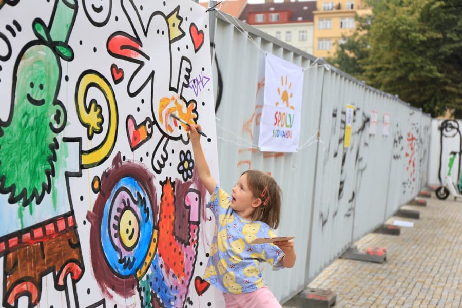 Na Jiřáku se na den objevila zeď, kterou si děti mohly ve středu 10. září pokreslit a zapojit se tak do tvůrčích aktivit se stánkem nadačního fondu Spolu s odvahou Česká republika.