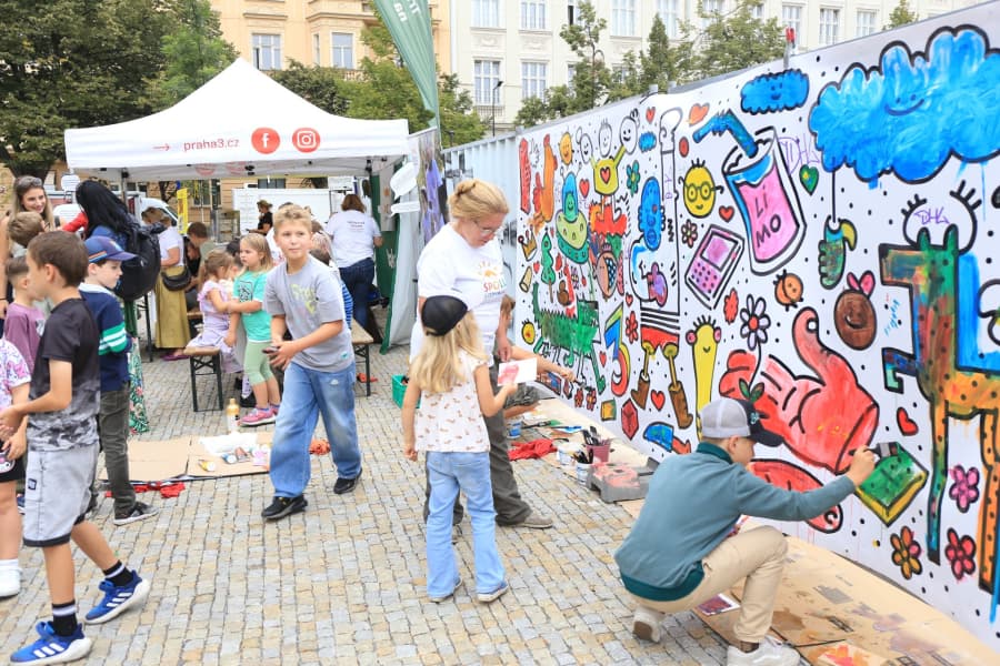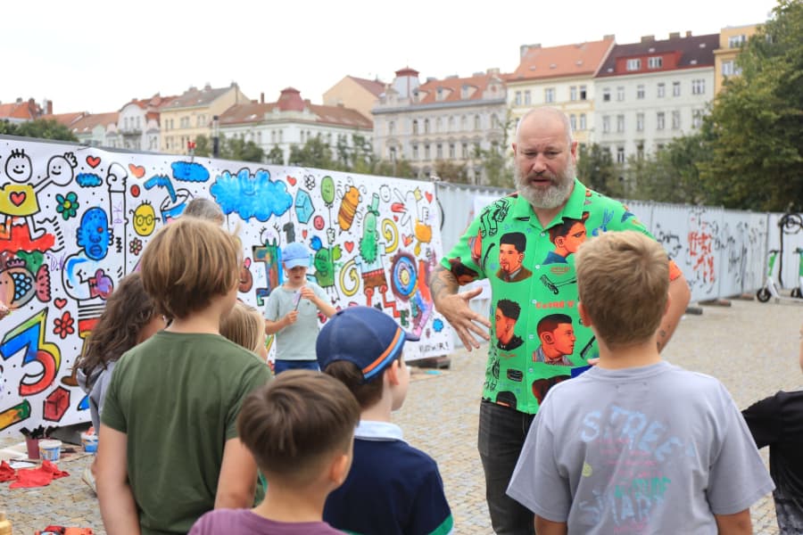 Už ve 14.00 se mohli všichni kolemjdoucí zapojit do streetartového workshopu s ilustrátorem Vladimírem Strejčkem přímo na náměstí Jiřího z Poděbrad. Kromě hlavní výtvarné zdi tu celý den probíhaly i menší výtvarné aktivity.