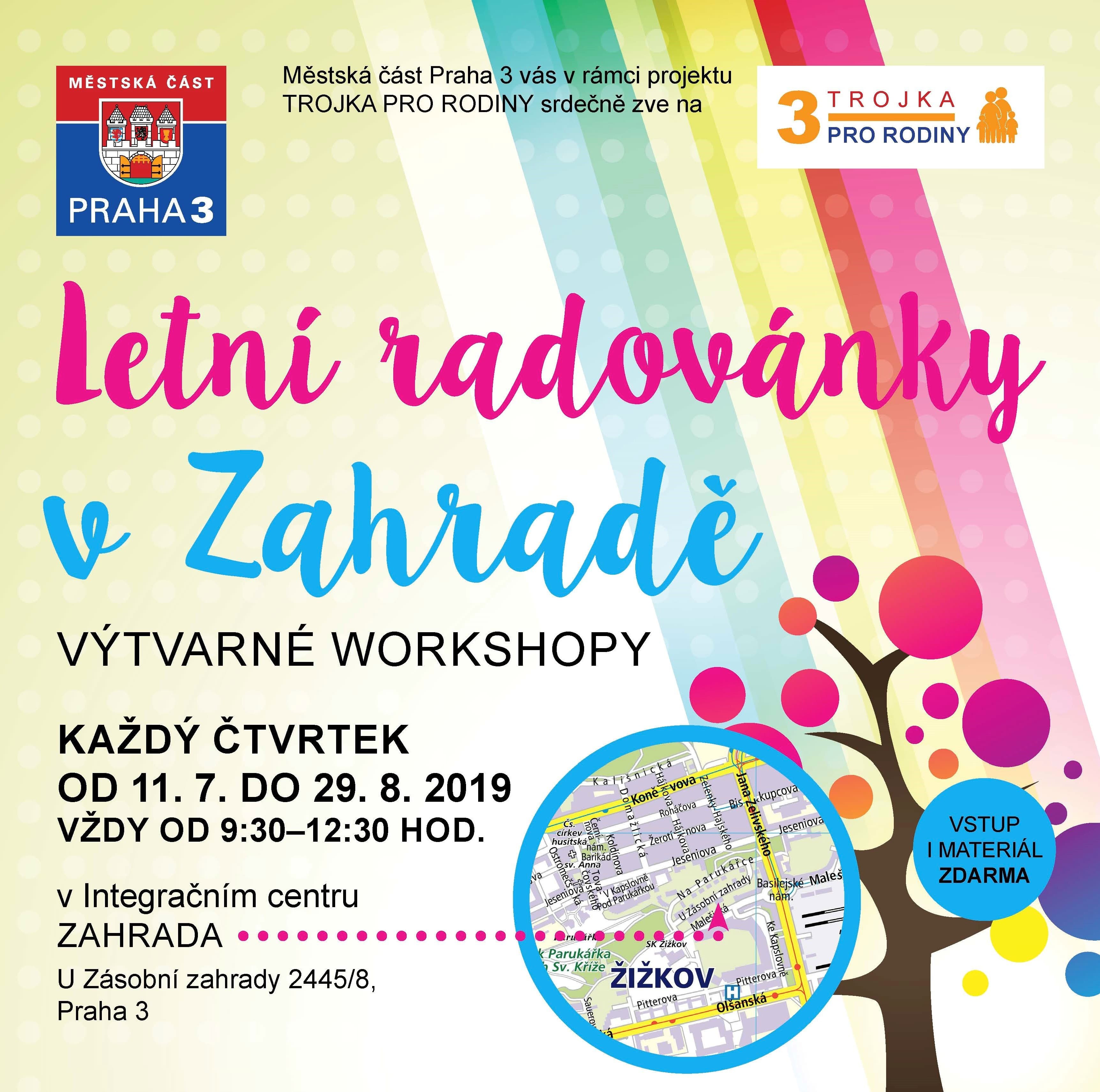 Výtvarné workshopy "Letní radovánky v zahradě" se uskuteční v rámci projektu Trojka pro rodiny. Budou probíhat každý čtvrtek od 11. 7. do 29. 8. vždy od 9:30 do 12:30 hod. v Integračním centru Zahrada (U Zásobní zahrady 2445/8, Praha 3). Vstup a materiál jsou zdarma.