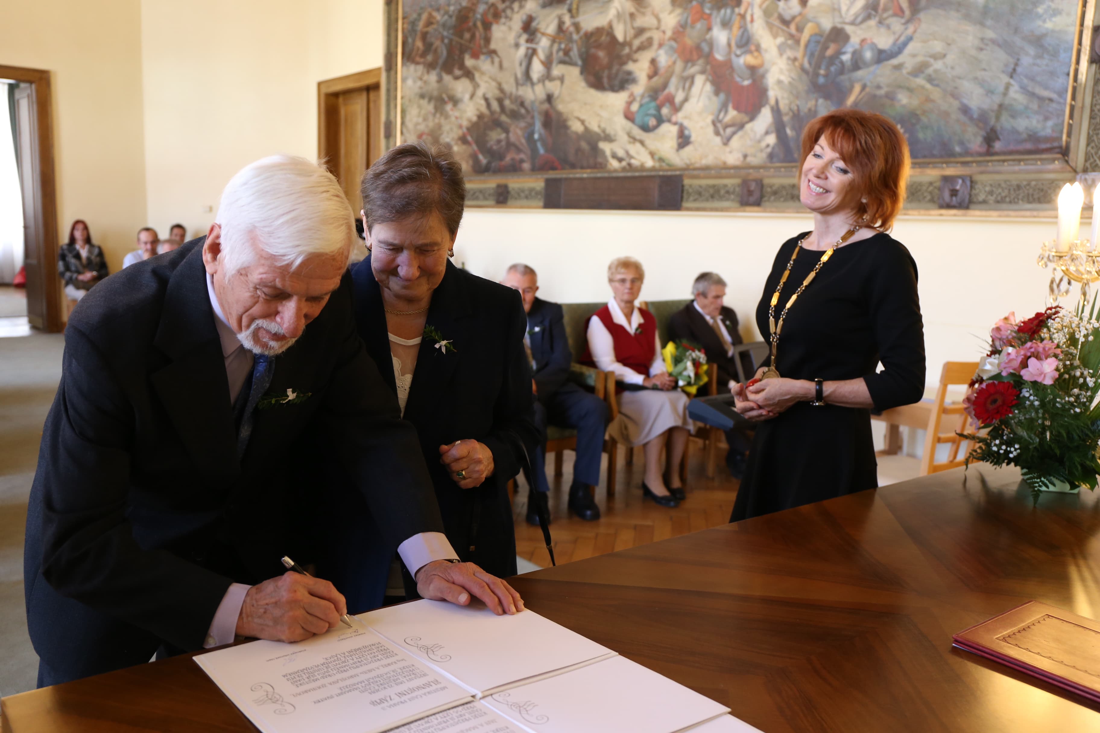 Obřadní síň žižkovské radnice v úterý 21. října přivítala sedm manželských dvojic, které tu slavily své diamantové, smaragdové a zlaté svatby a znovu si tak připomenuly svoje odhodlání jít spolu životem ve vzájemném porozumění a lásce.