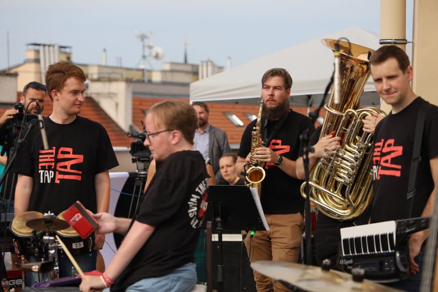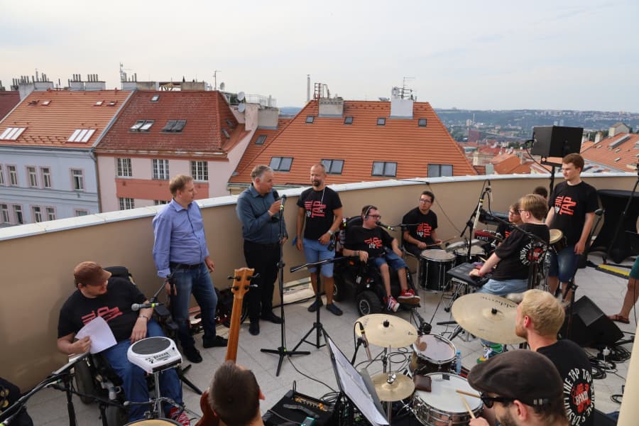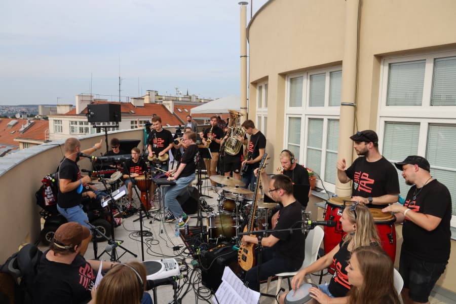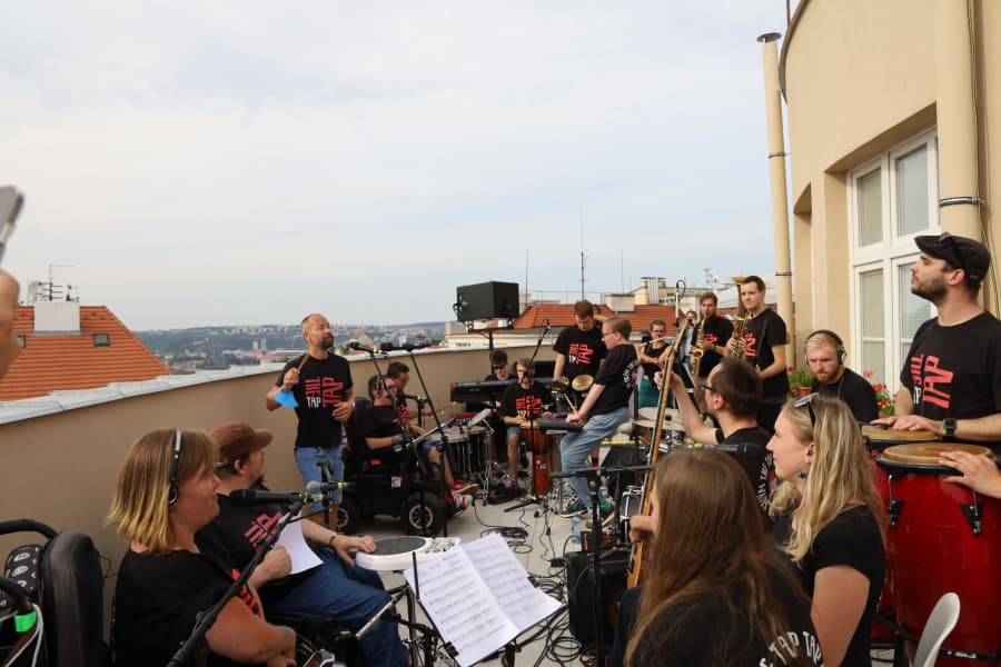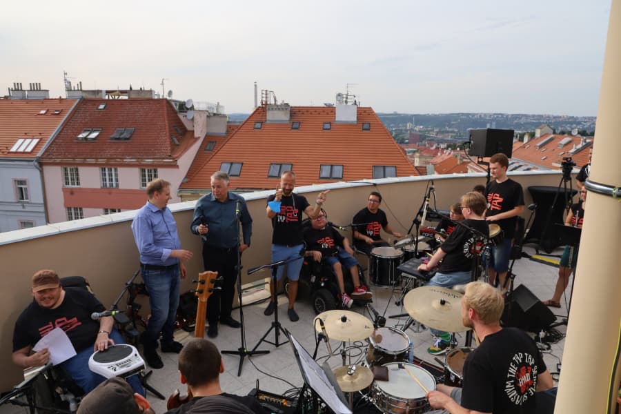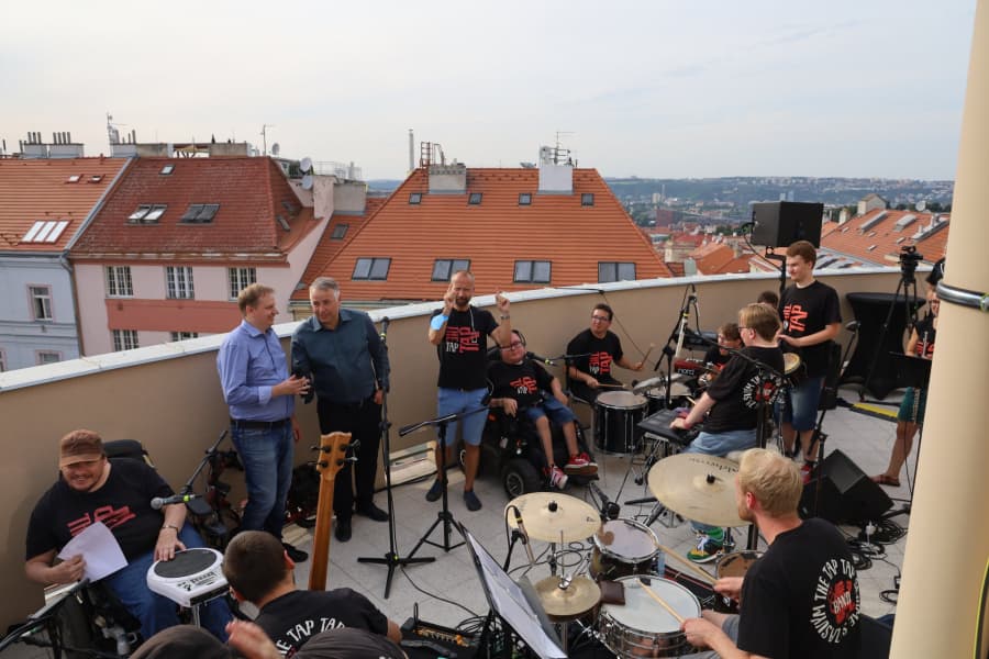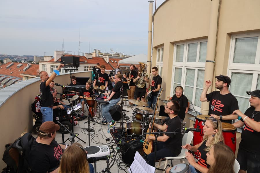 Zátěžovou zkouškou prošla díky kapele The Tap Tap, která zahrála přímo na terase. Na záznam se můžete podívat i zpětně zde. Na střechu se vešlo všech 20 členů kapely a zahráli přibližně 45 minut z poslední desky Noha na kolejích. Zazněly i dva nové hity Ray Charles z Karviné o pianistovi Petrovi a písnička Švihlá Jana o zpěvačce kapely. „Přijde mi super, že v Nemocnici sv. Kříže otevírají terasu i pro ležící pacienty. Praha 3 má pořád s bezbariérovostí trochu problém a tohle je velký krok správným směrem," říká kapelník The Tap Tap Šimon Ornest.