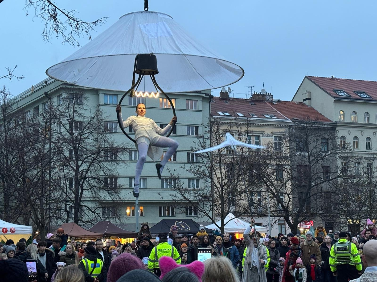 Tam se pak konala závěrečná akrobatická show divadelní skupiny Vosa Theatre, vyhlášení nejzajímavějších masek a večerní koncert kapely Trombenik. Návštěvníci si pochutnávali na koblihách, jitrnicích, langoších či speciálních nápojích. Slavilo se ještě dlouho poté, co průvod skončil.