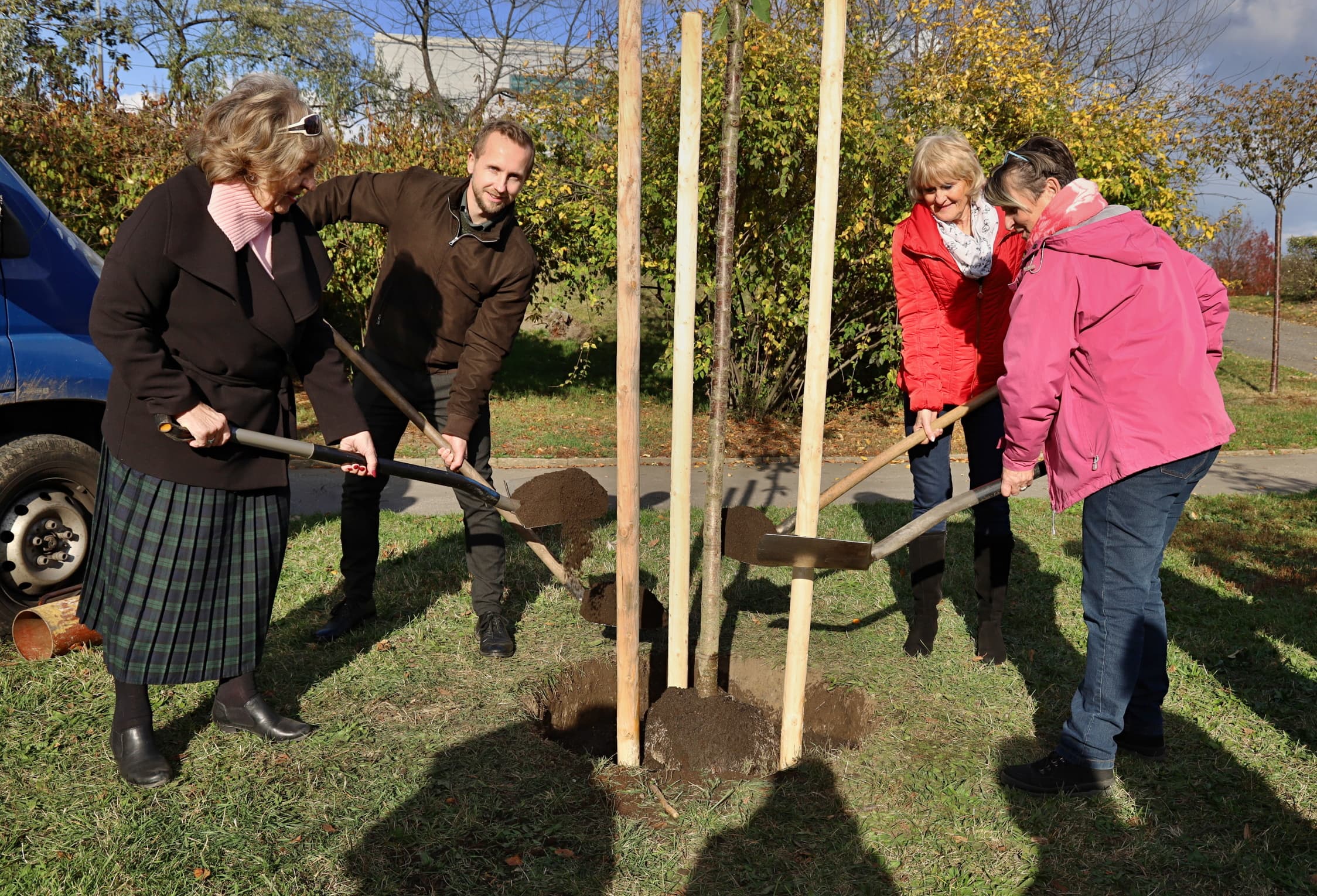 místostarosta Prahy 3 Ondřej Rut. Slavnostnímu zasazení předcházela úvodní řeč ředitelky Aliance Eva Knappové, která poděkovala za realizaci výsadby zastupitelům městské části, svým kolegyním a kolegům. Vzpomněla také na ty, kteří se tohoto okamžiku již nedočkali. Přítomní na krátký okamžik ozdobili kmen sakur barevnými stužkami,