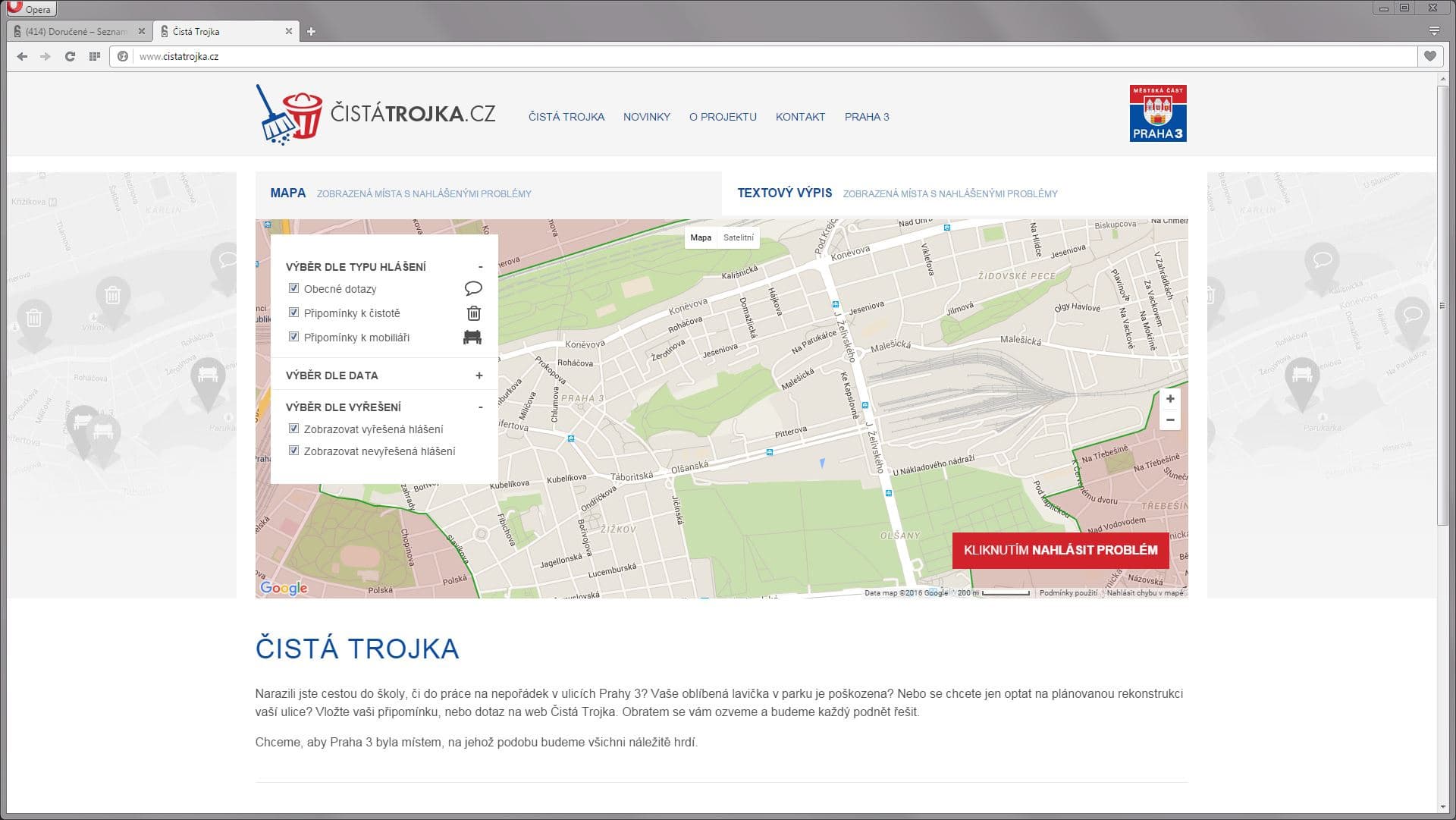 Čistá Trojka je uživatelsky přívětivý a moderní komunikační kanál mezi občany a úřadem. Stěžejním prvkem veřejné části webu bude interaktivní mapa Prahy 3, do které bude možno zapichovat virtuální špendlíky s textovou informací o problému, který chce občan nahlásit. „Typickým hlášením může být oznámení černé skládky, informace o nefunkčním veřejném osvětlení, poškozeném městském mobiliáři nebo jakýkoliv jiný dotaz vztahující se k veřejnému prostoru městské části,“ vysvětluje princip aplikace místostarosta Materna. Tato hlášení jsou zaznamenána do systému a notifikována odpovědnými úředníky. Úřad na každý podnět adekvátně a veřejně reaguje například tím, že na místo vyšle hlídku, která nahlášené nedostatky odstraní nebo třeba v případě svozu odpadu zajistí sjednání nápravy u Pražských služeb. „Jako o logicky navazujícím prvku uvažujeme o aplikaci pro mobilní telefony, která by umožnila nahlásit podnět přímo z ulice. Pro tento krok se ale chceme rozhodnout až v případě, že se novinka ujme,“ dodává místostarosta Materna.