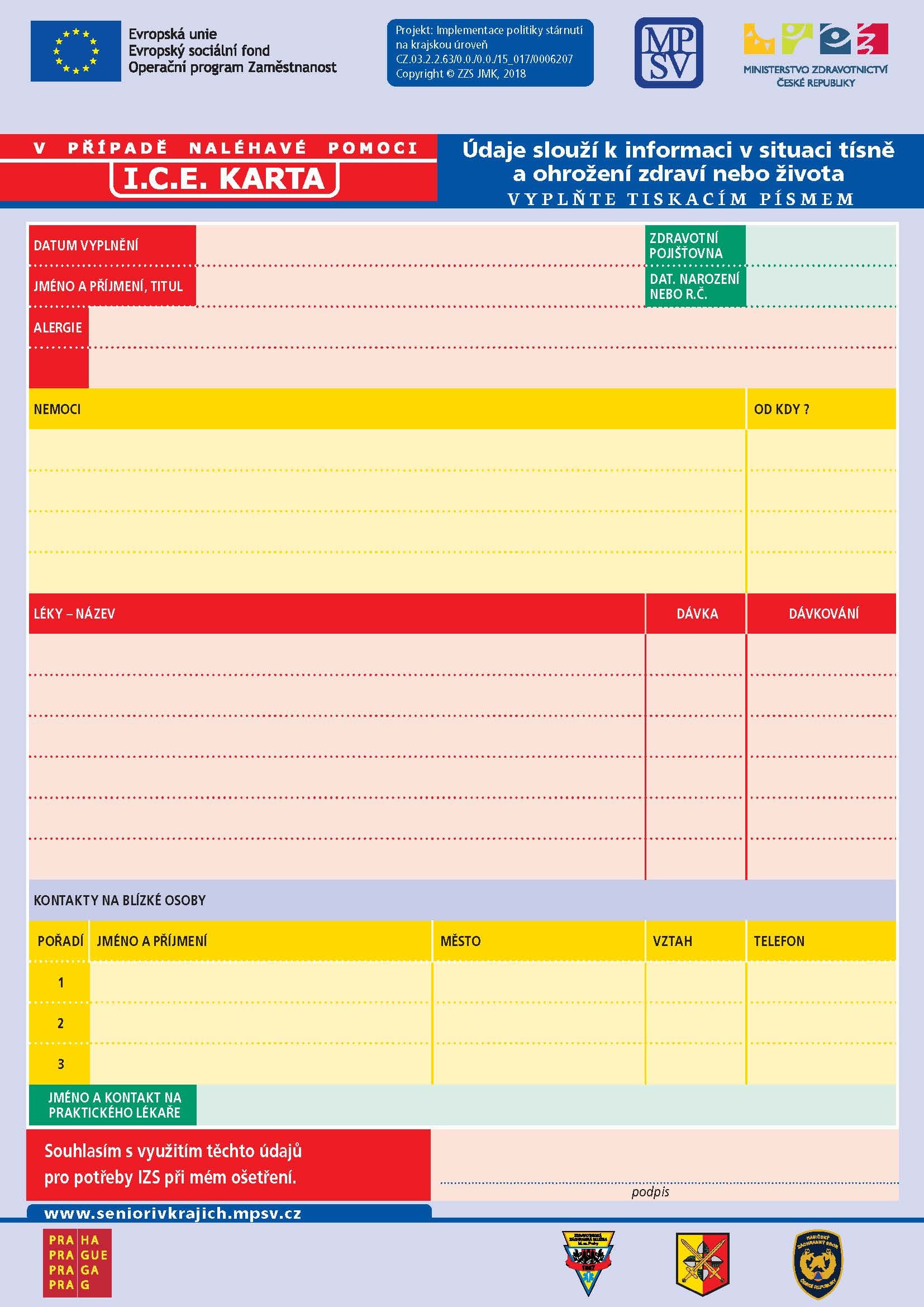 Na předtištěnou I. C. E. kartu (In Case of Emergency) vyplní senior základní údaje o svém zdravotním stavu, o svých alergiích, nemocech, lécích včetně dávkování a také kontakty na praktického lékaře a blízké osoby. Karta se pak v plastové obálce umístí na dobře viditelné místo v bytě – doporučuje se umístění na vnitřní straně vchodových dveří nebo na dveřích lednice.