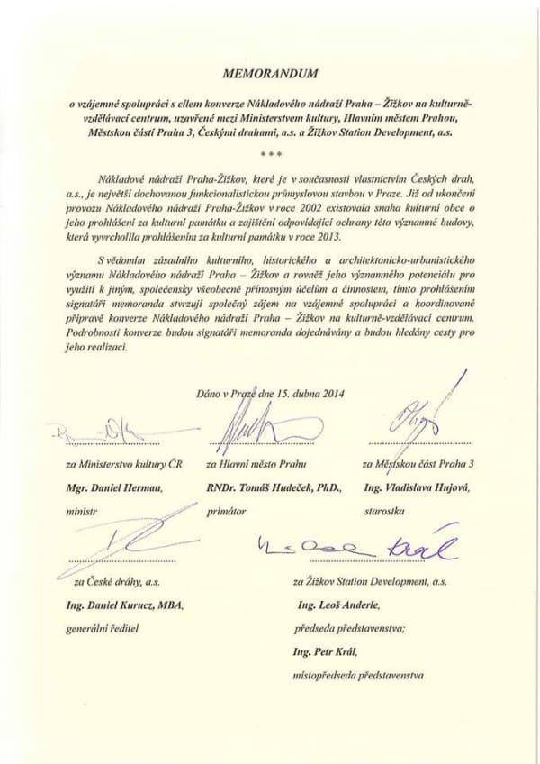 Ministr kultury Daniel Herman, primátor hlavního města Prahy Tomáš Hudeček, starostka Prahy 3 Vladislava Hujová, generální ředitel Českých drah Daniel Kurucz a Leoš Anderle a Petr Král ze společnosti Žižkov Station Development stvrdili svým podpisem memorandum o vzájemné spolupráci při přípravě konverze Nákladového nádraží Žižkov na kulturně-vzdělávací centrum. Memorandum podepsali v prostorách funkcionalistické stavby nádraží, které bylo loni prohlášeno kulturní památkou.