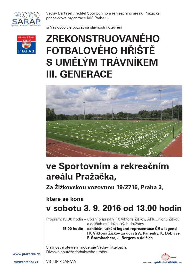 V sobotu 3. září od 13 hodin se uvede do provozu nově zrekonstruované fotbalové hřiště s umělým trávníkem III. generace ve Sportovním a rekreačním areálu Pražačka, Za Žižkovskou vozovnou 19/2716. Slavnostní akt budou doprovázet fotbalová utkání mládežnických družstev nebo fotbalových legend reprezentace ČR, pro diváky bude připravena soutěž fotbalového umění.