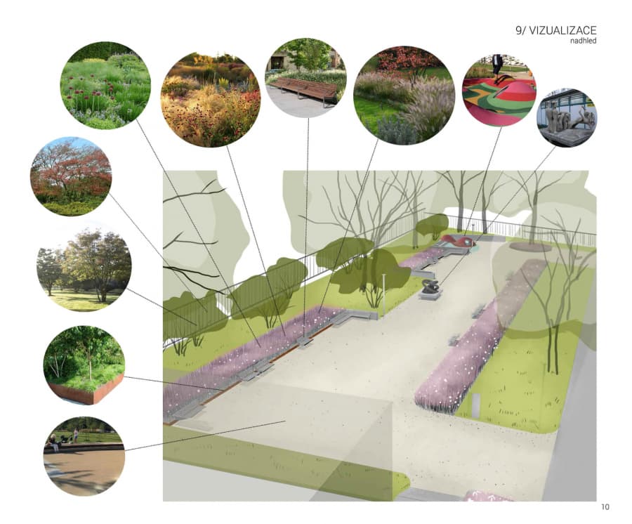 „Park jsme pojali jako klidový a reprezentativní. V rámci revitalizace jsme použili novodobé technologie“, uvádí Martina Forejtová, vedoucí architektka z ateliéru Land05. „Příkladem je dešťový záhon, který v sobě skloubí hned několik zajímavých funkcí. Při dešti pojme velké množství vody, která je sem sváděna ze zpevněných ploch, a když se vyčasí, postupně ji zase odpaří. Osázen správně volenými trvalkami a okrasnými travinami pak pomáhá bojovat se suchem a horkem, která panují uprostřed velkých měst. Květy trvalek jsou atraktivní nejen pro lidi, ale je i zdrojem potravy v podobě nektaru a pylu a dešťový záhon se tak stává útočištěm pro hmyz, ale i pro jinou drobnou faunu,“ doplňuje Forejtová.