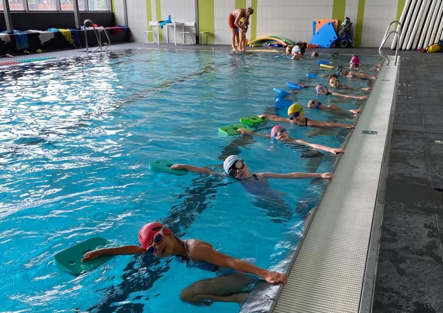 Během lekcí v bazénu na Pražačce si holky a kluci za přítomnosti instruktorů osvojují nejen techniky plavání, ale například taky pomoc kamarádovi v nesnázích.