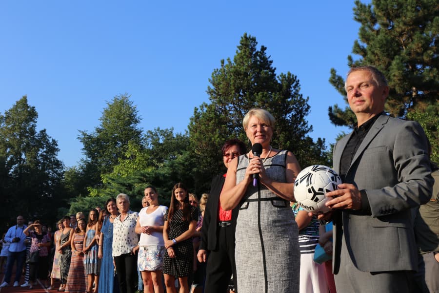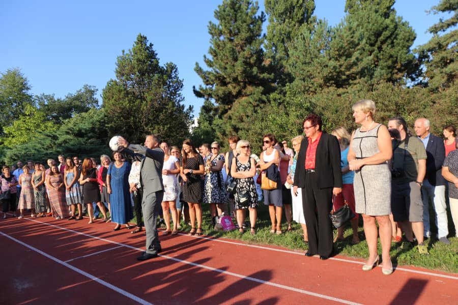 Poté symbolicky pokřtil nový trávník fotbalovým míčem, který hodem daroval publiku před sebou, a oslavy pokračovaly nastoupením nových třech tříd, čítajících dohromady 90 prvňáčků.