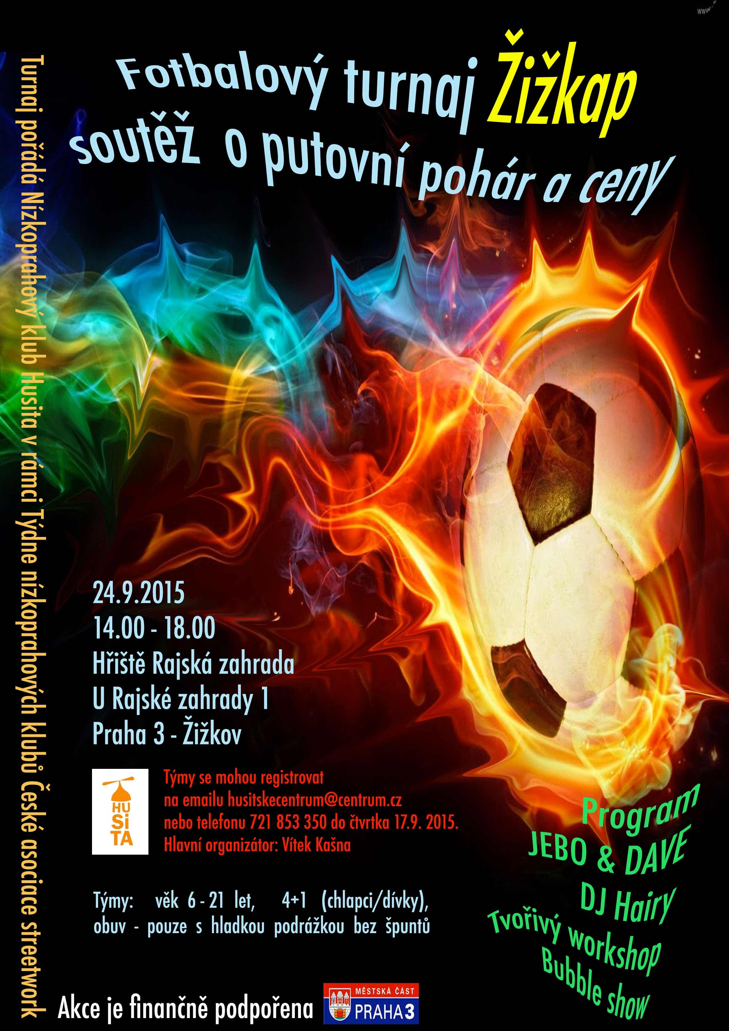 Fotbalový turnaj Žižkap pro pětičlenné týmy ve věku od 6-21 let se koná 24. září od 14 do 18 hodin na hřišti U Rajské zahrady 1 v Praze 3.