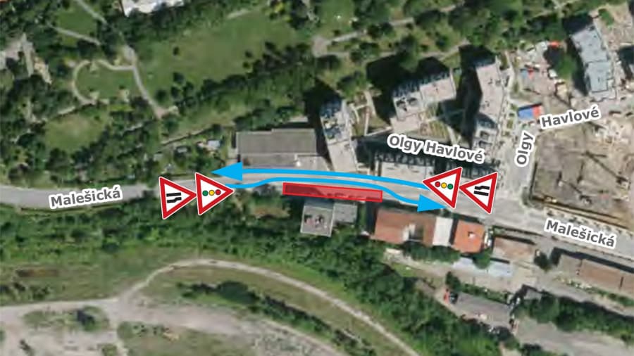 Z důvodu připravované nové výstavby Residence nádraží Žižkov a s tím souvisejícími stavebními a výkopovými pracemi pro přípojky inženýrských sítí dochází od 14. 4. do 29. 5. 2026 (ve více etapách) k dopravnímu omezení na komunikaci Malešická v úseku Ambrožova – K Červenému dvoru (resp. v blízkosti objektu Malešická 881/41) – částečné uzavírce spočívající v uzavření jízdního pruhu ve směru ke křižovatce s komunikací K Červenému dvoru. V první a druhé etapě (od 14. 5. do 18. 5. 2026) bude provoz bude řízen kyvadlově světelným signalizačním zařízením (SSZ).